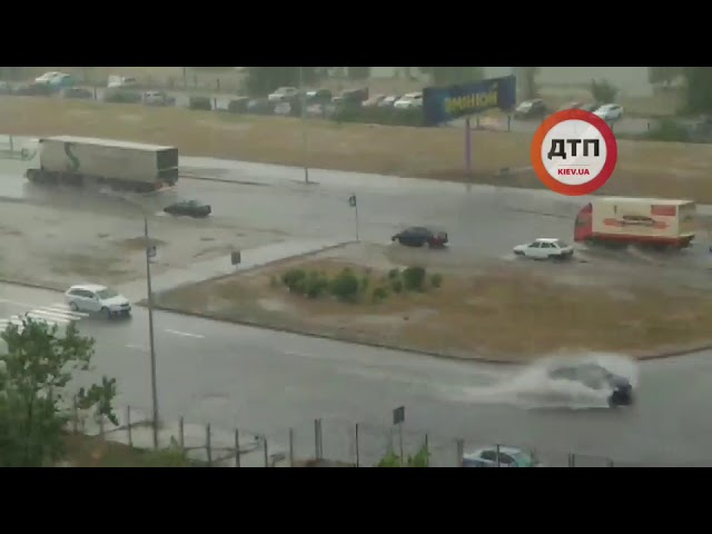 Вечером 17 июня в Киеве прошел сильный ливень с порывами ветра. Обильные осадки быстро затопили дороги. На Троещине еле-еле ездят машины, так как уровень воды местами достает до радиаторов.