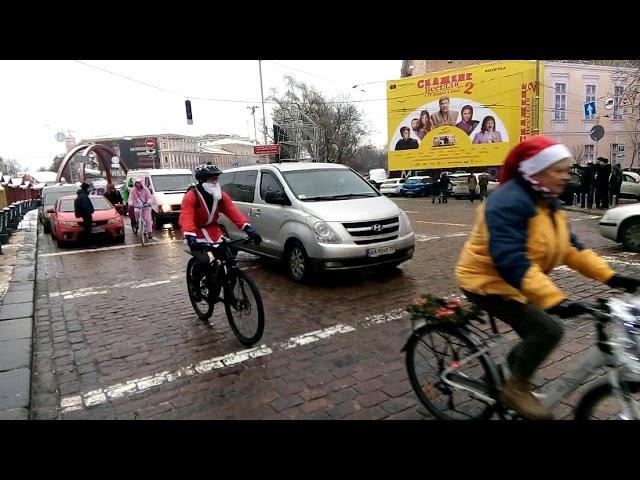 29 декабря в столице Украины прошел первый новогодний велопарад. Владельцы двухколесных проехались от елки к елке в рамкам мероприятия bike2holidays. Акция стартовала на Софийской площади, а завершилась - на Контрактовой. Во время флешмоба люди в смешных костюмах катались по улицам Киева и поднимали настроение прохожим.