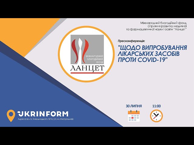 Международный благотворительный фонд содействия развитию медицинской и фармацевтической науки и образования "Ланцет" провел пресс-конференцию "О промежуточных результатах клинических испытаний лекарственных средств, облегчающих протекание коронавирусной инфекции COVID-19". В ней приняли участие гендиректор Директората фармацевтического обеспечения Минздрава Александр Комарида, заведующий кафедрой клинической фармакологии и клинической фармации Национального фармацевтического университета, национальный координатор клинического испытания Игорь Зупанец, заведующая кафедрой инфекционных болезней Национального медицинского университета имени А. А. Богомольца, национальный координатор клинического испытания Ольга Голубовская. Мероприятие прошло в "Укринформе".