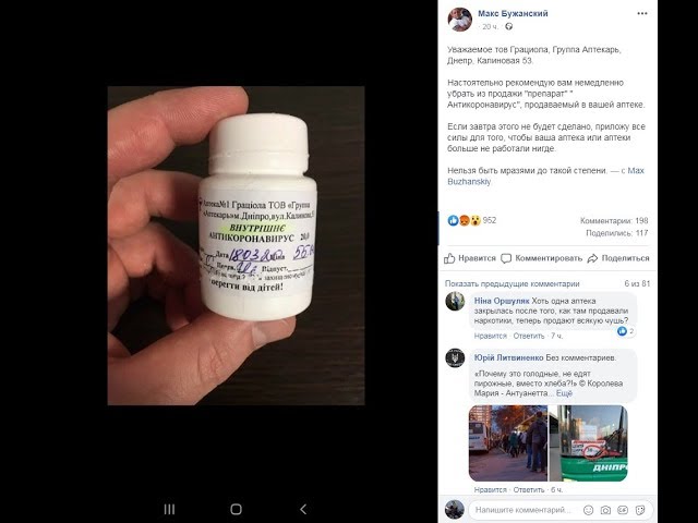 В марте журналисты "9 канала" наведались в эту аптеку и попросили лекарство от коронавируса. Им объяснили, что таких не продают. Тогда представители канала спросили о средстве "Антикоронавирус", о котором узнали из соцсетей. Представитель аптеки Сергей объяснил, что на днях его продавали в аптеке.