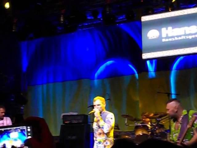 "Вопли" появились на сцене, украшенной национальным флагом, и начали: "Шоб таке зробити, коли нема роботи..." Публика овациями восприняла появление Олега Скрипки, который как всегда солировал то на трубе, то на баяне "дуже майстерно".