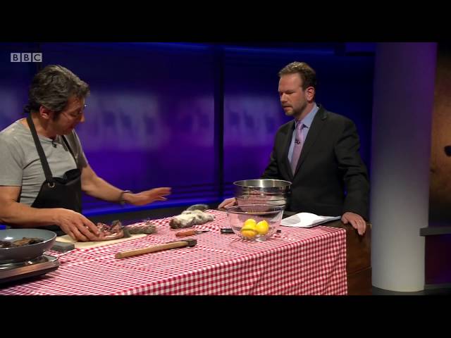 Он попеременно снял шкуру с каждого мертвого животного, отрезал хвост и разрезал вродь каждой лапки, затем мариновал их в лимонном соке и зажаривал. Отведать блюдо согласился ведущий шоу Джеймс О’Брайен. Есть мясо он собрался с красным вином, однако белка не поддалась ножу и ведущий просто откусил ее, воскликнув: "Это совершенно съедобно!"