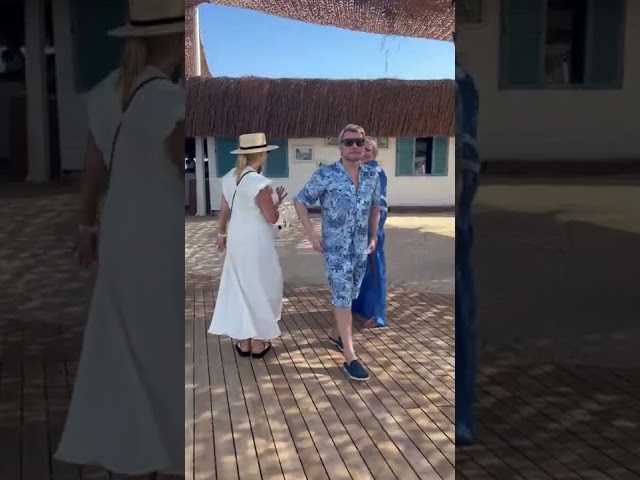 На втором он разговаривает со своей спутницей и еще одной женщиной. Замечая, что его снимают, идет в сторону автора видео. Девушка задает ему вопрос.