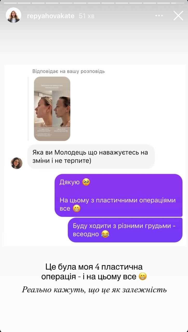 Жена Виктора Павлика Екатерина Репяхова сделала еще одну пластическую операцию. В сторис Instagram девушка рассказала, что решилась на повторное хирургическое вмешательство, чтобы исправить пластику подбородка, результатом которой она была недовольна. По словам Екатерины, она до последнего колебалась - ставить новый имплант или просто вынуть старый. Окончательное решение она приняла за 15 минут до операции.