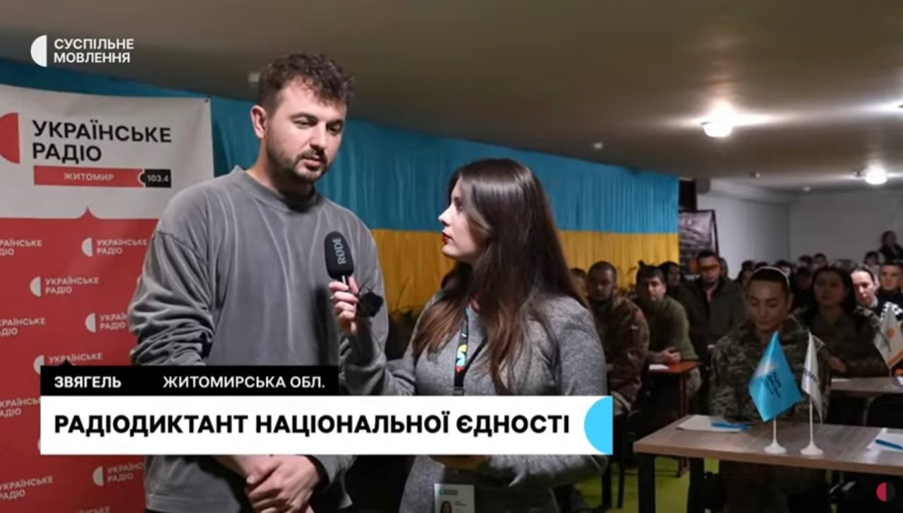Шоумен и блогер Евгений Янович присоединилась к радиодиктанту национального единства в Звягеле Житомирской области. Он писал диктант вместе с военным и спасателями ДСНС.