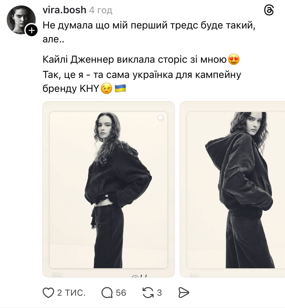- Не думала, что мой первый тредс будет таким, но... Кайли Дженнер выложила сторис со мной. Да, это я - та самая украинка для кампании бренда KHY, - написала Вера в соцсети.