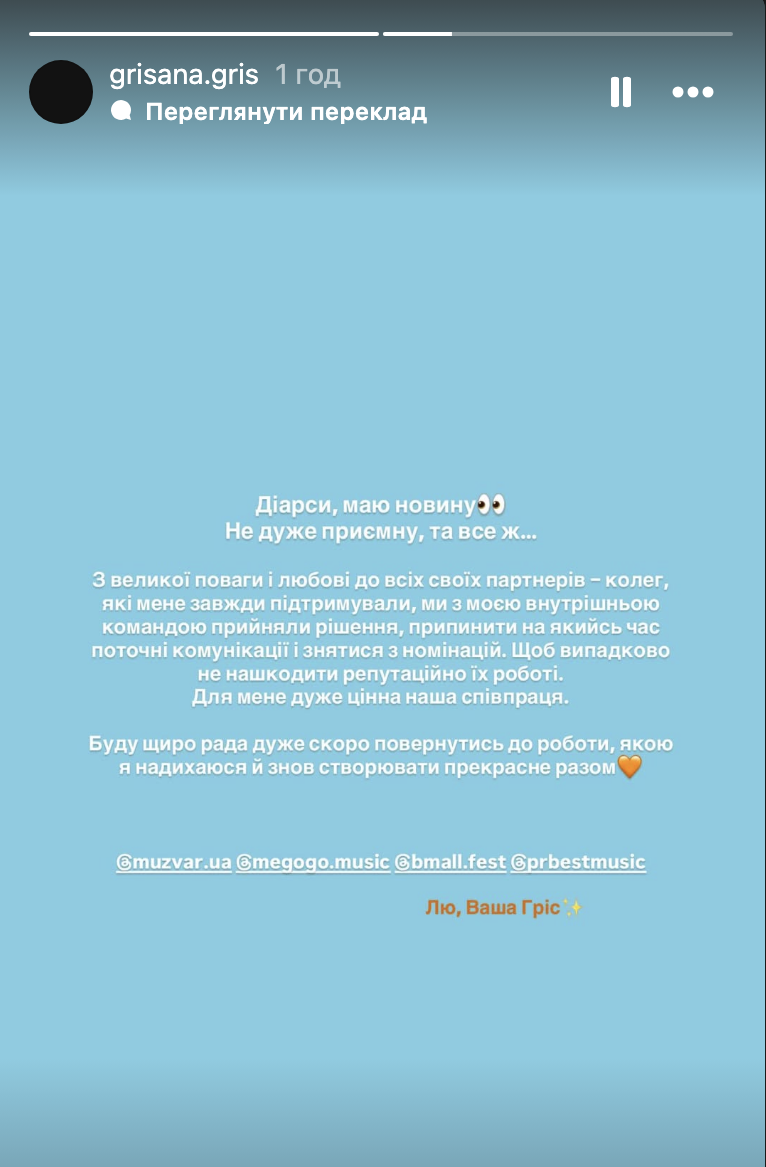 Певица Grisana снялась с номинаций музыкальных премий Muzvar и Megogo, чтобы "не навредить репутации их работы". Об этом она сообщила во сторис Инстаграма.