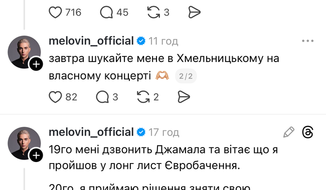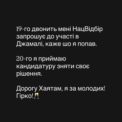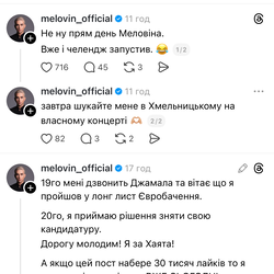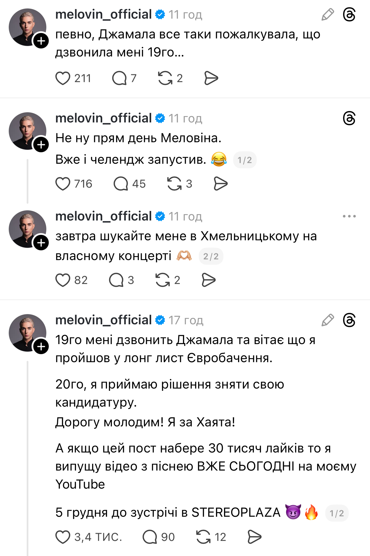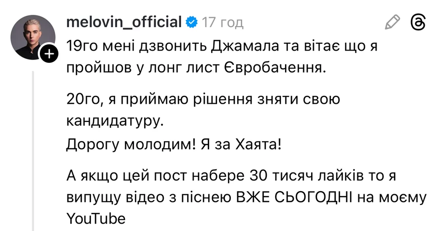 Поводом для шуток также стала фраза Меловина, что он снимается с Нацотбора, чтобы дать дорогу молодым, в частности, певцу KHAYAT. Ирония в том, что им обоим по 28 лет.