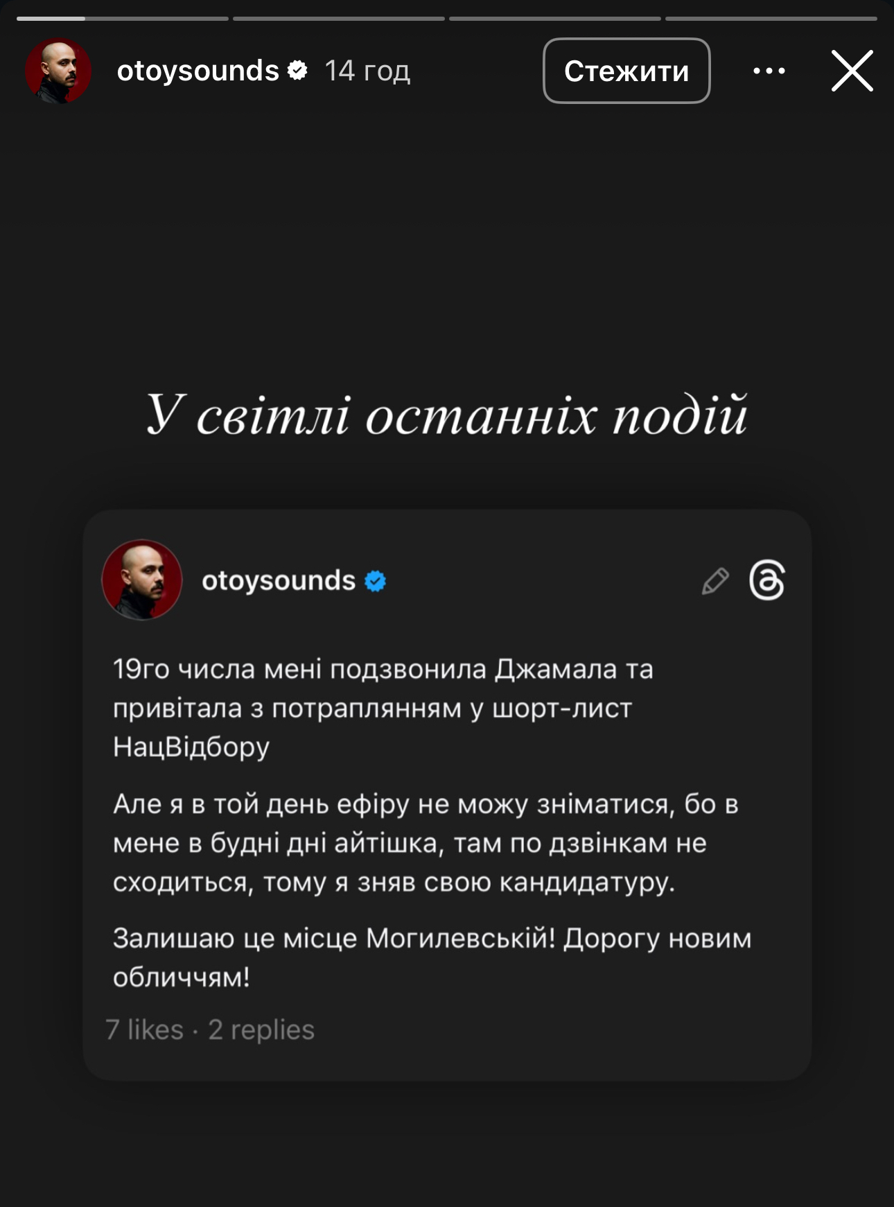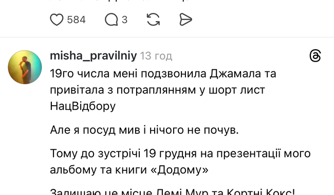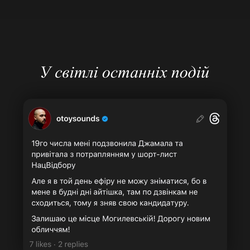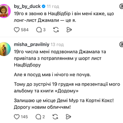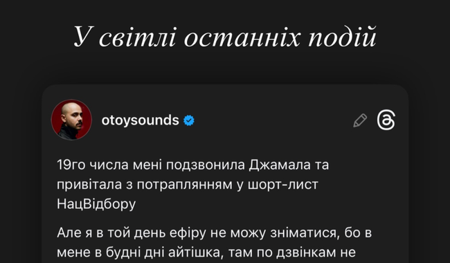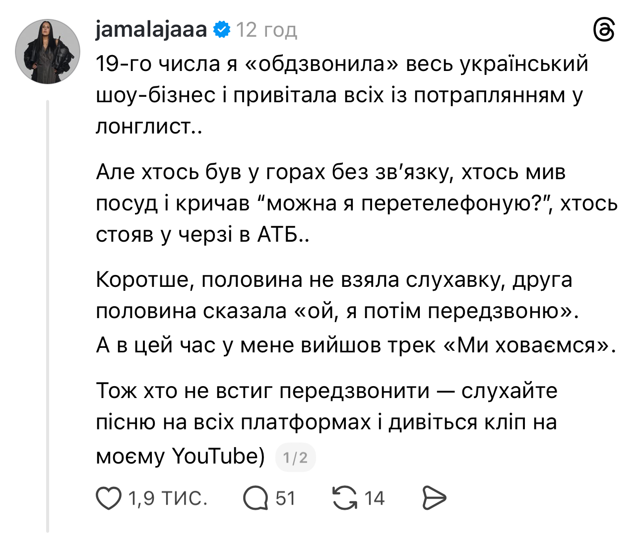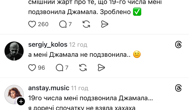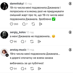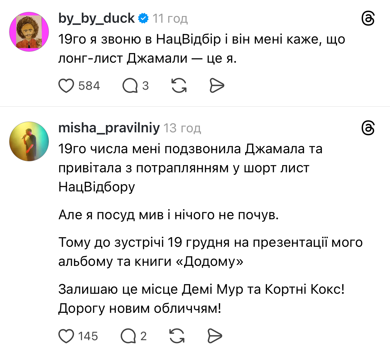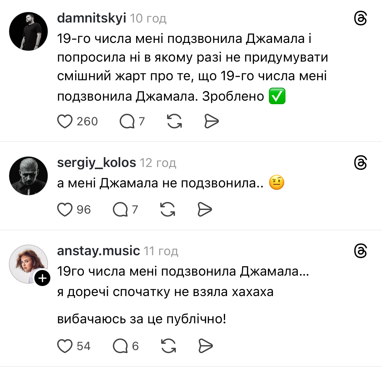 Пост певца Melovin о том, что 19 ноября ему позвонила Джамала и поздравила с попаданием в лонглист Нацотбора, породила кучу мемов и даже запустила флешмоб. Коллеги начали пародировать его сообщение. Otoy, Марина Krutь, Абие, Василий Байдак, Шугар, Миша Правильный и другие в шутливой манере утверждают, что им тоже 19-го звонила Джамала.