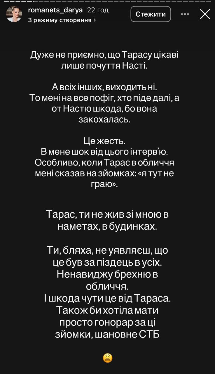 – Это жесть. У меня шок от этого интервью. Особенно когда Тарас в лицо мне сказал на съемках: «я здесь не играю». Тарас, ты не жил со мной в палатках, домах. Ты, жесть, не представляешь, что это был за пиздец у всех. Ненавижу ложь в лицо. И жаль это слышать от Тараса. Также хотела бы иметь просто гонорар за эти съемки, уважаемое СТБ, - написала Романец.