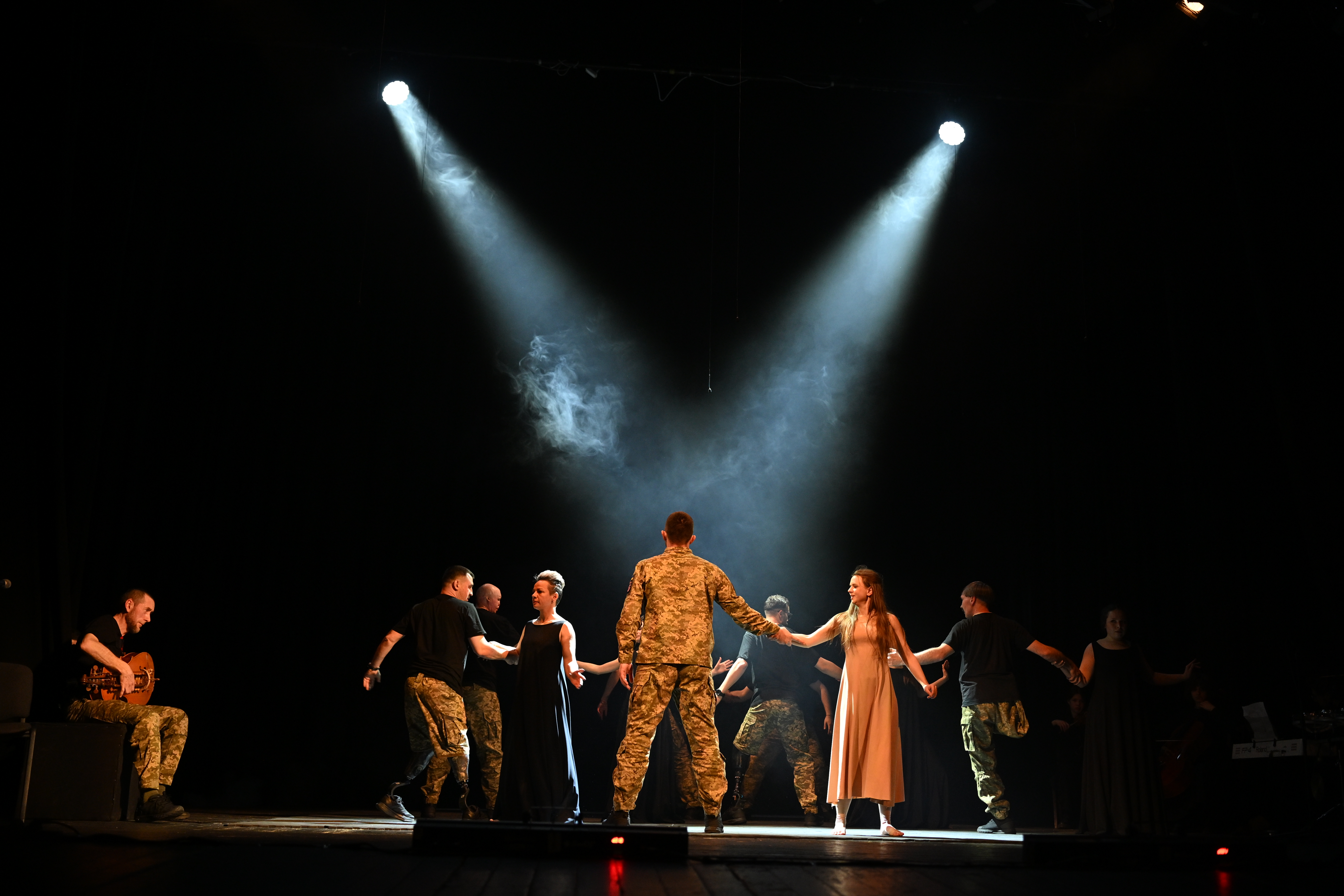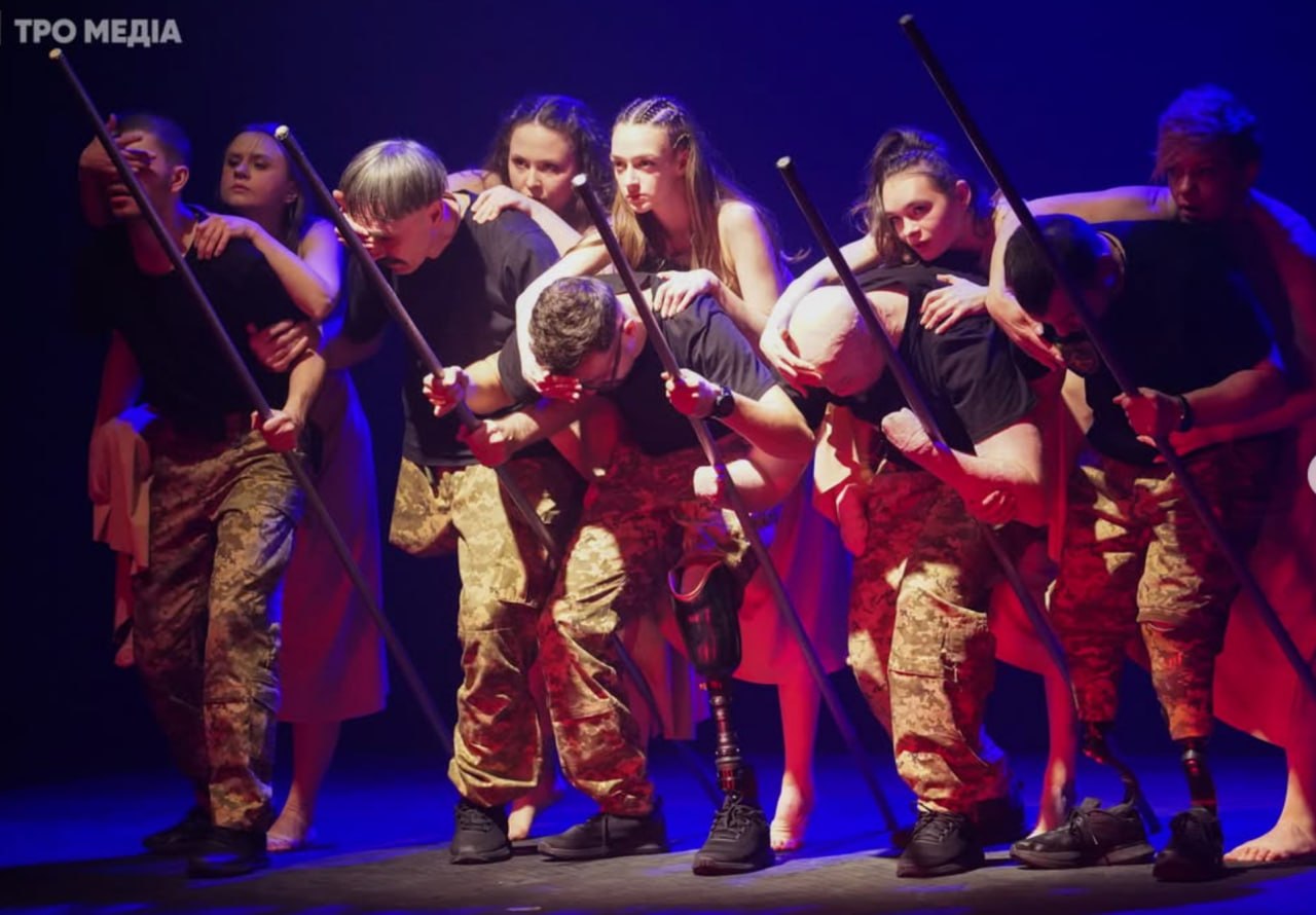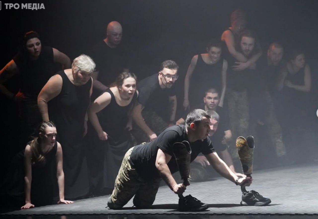 - У вас в спектакле пластическая драма сочетается с документальным театром, потому что несколько ветеранов рассказывают со сцены свои истории. Особенно меня поразил монолог Егора Бабенко - реально холод по спине: человек шутит о своих ушах, что на них нельзя навешать лапшу, - а ушей нет, потому что он потерял их в результате ранения от пожара. А еще о том, что он не может показать миру средний палец, а у него не осталось ни одного на обеих руках. Это какая же у парня самоирония...
