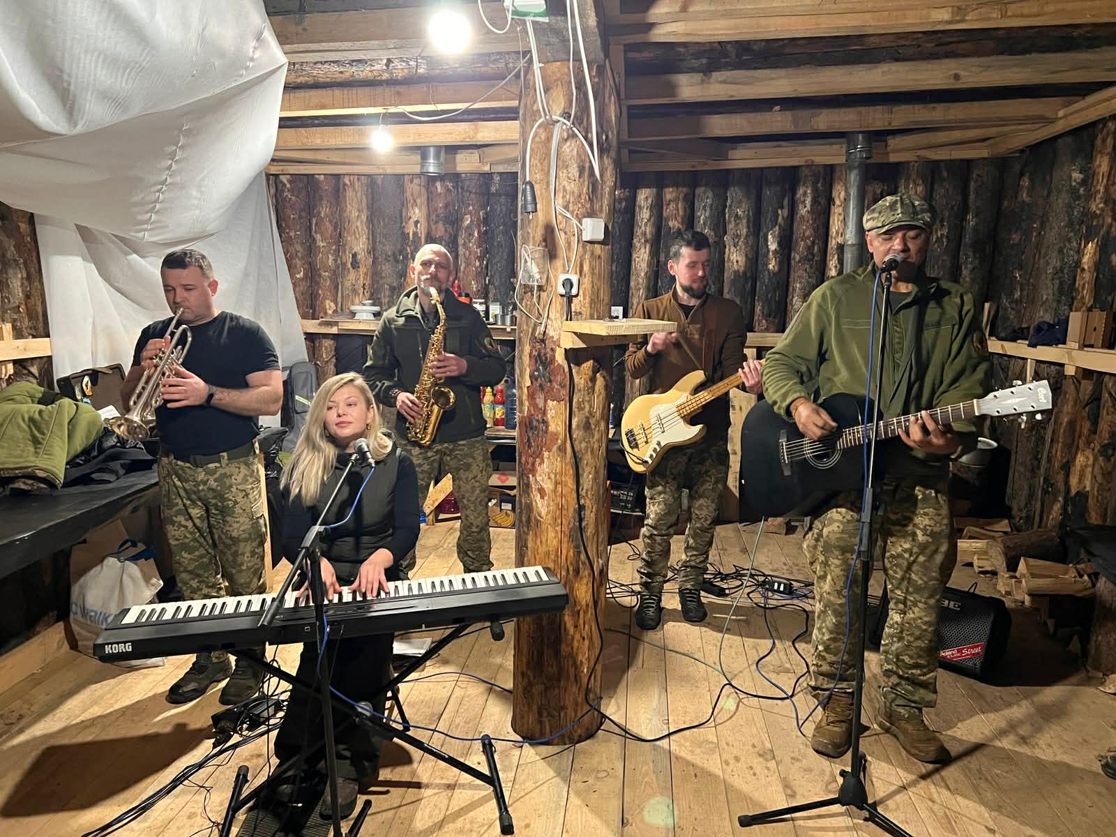 Мы свою группу называем ИБАШ – это аббревиатура, которая означает Инструментально-Блиндажный Ансамбль Шансона. В состав входят контрабас, труба, саксофон, ну и я с гитарой. Также у нас есть одна гражданская девушка Юлия Франк, играет на фортепиано, ну и иногда поет. Поскольку группа очень мобильная, мы заходим в любое расположение, нам не нужно много места и много времени, чтобы подготовиться к выступлению.