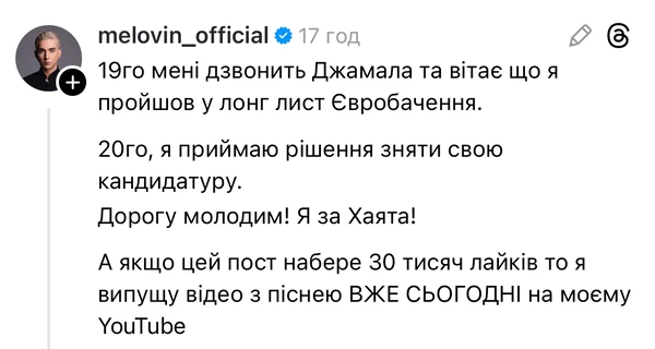 Melovin заявил, что прошел в лонглист нацотбора, но снял свою кандидатуру