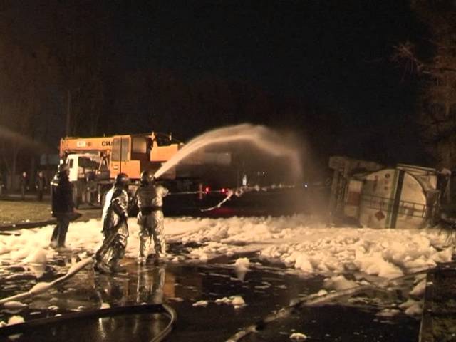 Район ДТП изолировали не только от зевак и проезжавших мимо авто, но и от электроснабжения. Само же место разлива и цистерну спасатели залили специальной пеной и посыпали песком, а потом эту смесь вывезли для утилизации. А вот чтобы убрать лежавший на боку бензовоз, пришлось подключить два крана, которые подняли его и отбуксировали на стоянку. Ликвидация последствий ДТП окончилась около полуночи.