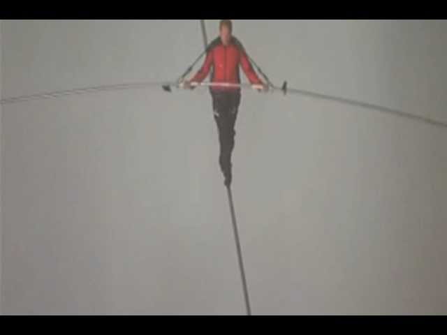 Особую трудность для смельчака представляли многочисленные брызги, а также отсутствие стабилизирующих тросов, которые могли бы уменьшить раскачивание основного каната, пишет