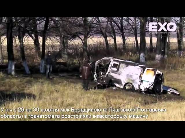 В ночь с 29 на 30 октября на трассе Днепропетровск-Киев вблизи села Ляшковка Царичанского района неизвестные обстреляли инкассаторский автомобиль. Все работники погибли, деньги украдены. По информации правоохранителей, до этого машину обстреляли из гранатометов на территории Полтавской области.