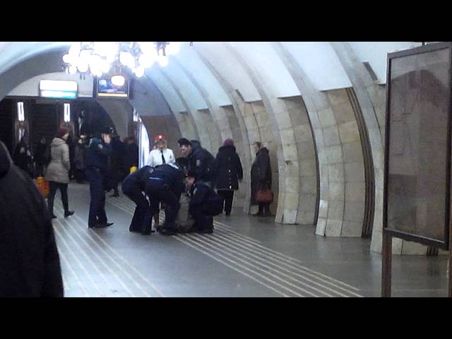 Пассажира довезли до станции "Лыбедская", где вытащили на перрон и надели наручники. Он был в грязной рубахе и серых спортивных штанах, с коротко остриженными черными волосами и босой. На Вид – около 40 лет. К эскалаторам его тащили волоком. На ноги он становиться отказывался.