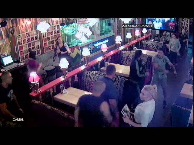 Короткую стычку зафиксировала камера наблюдения кафе "Чайхана". На видеозаписи видно, как молодые люди бодрым шагом зашли в заведение. В этот момент двое мужчин выходили из зала и оказались на пути троицы. Артур Бирюк достал из шорт пистолет и подошел к мужчинам. Буквально после нескольких слов, он сильным ударом в голову уложил посетителя в спортивном костюме. Тут на помощь к нему подоспел Евгений Корнийко, который сзади подошел к товарищу первого мужчины и нанес ему неожиданный удар.