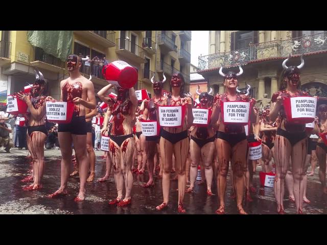 Дабы выразить свое недовольство они выбрали весьма необычную форму протеста: на главной площади Памплона полуобнаженные люди в рогатых шлемах вылили на себя более 135 литров искусственной крови, при этом скандируя лозунги против жестокости к животным. К этой акции присоединились активисты с Австралии, России, Швеции и Великобритании.