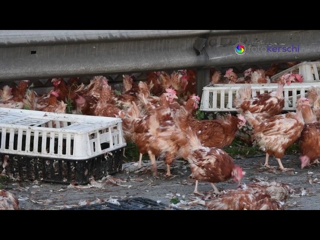 Авария произошла в районе Линца. Ящики птицей разлетелись на 160 метров. Некоторые куры погибли, другие сбежали.