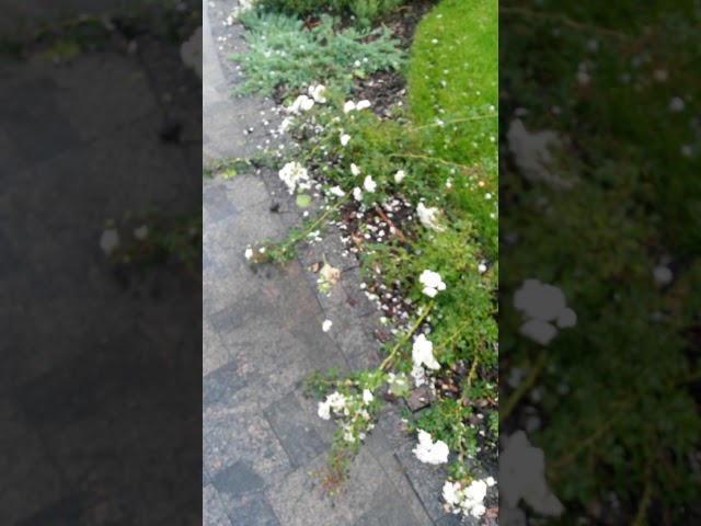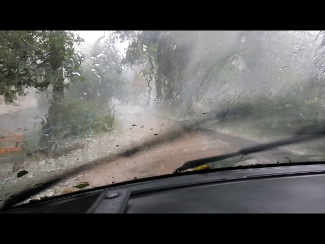 Ливень начался около 19:00 после дневной жары в центре города, а улицы в районе Херсонского шоссе засыпало крупным градом словно снегом.