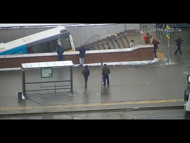 На видеозаписи маневров автобуса видно, как тот, после стоянки у общественной остановки, начал движение. На малой скорости он пересек тротуар и врезался в ограждение лестницы подземного перехода, а затем по инерции поехал вниз. При этом попыток маневрировать рулем не наблюдается.