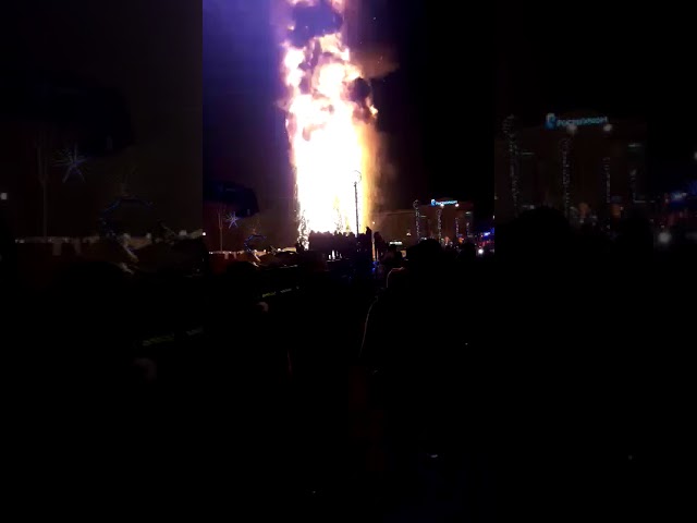 Спасатели приехали на место пожара очень быстро, но спасти искусственное дерево не удалось, от него не осталось и следа. На месте остался только металлический каркас. Пожар тушили под новогодние песни веселые реплики ведущего.