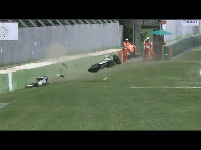 На одном из поворотов его мотоцикл зацепил 27-летний итальянец Бастанелли. В сети есть видео аварии, на котором видно, как гонщик вылетает за пределы трассы и на большой скорости ударяется в отбойник, а его мотоцикл буквально разлетается на куски.