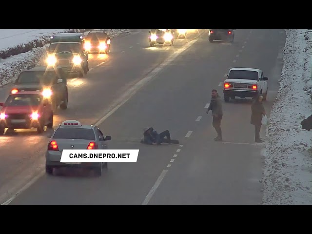 На видео, опубликованном на канале YouTube cams.dnepro.net, видно, как женщина с собакой переходит четырехполосную дорогу на проспекте Юбилейном. Немного позади нее идут двое мужчин . Собака выбегает вперед, едва не попадая под колеса "Жигулей".