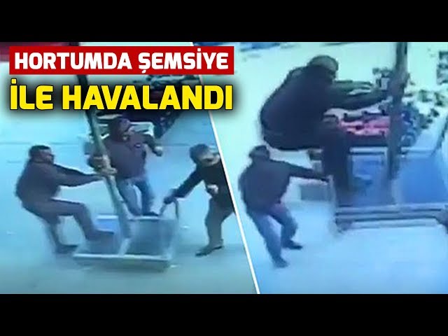 Трое приятелей сидели в кафе на территории овощного рынка и пили чай, когда увидели, что зонт уносит ввысь. Один из них, Садык Коджадаллы, пытался удержать зонт во дворе, встав на него, но в итоге поднялся над землей.