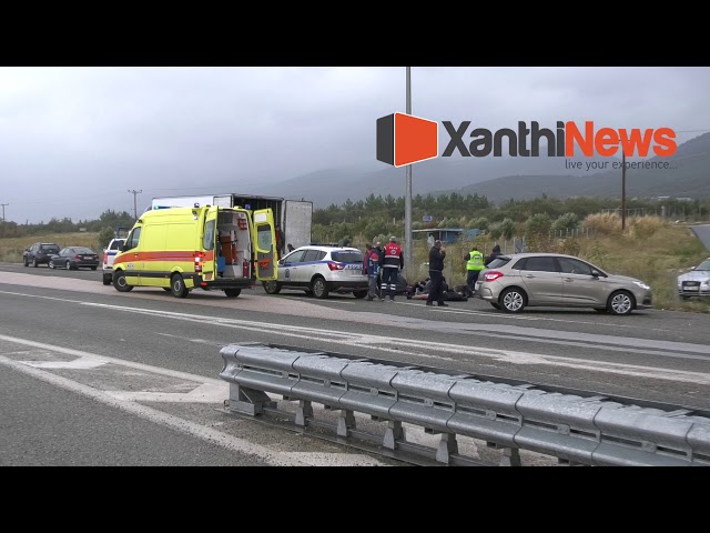 Полиция остановила контейнеровоз на пункте сбора платежей на платной автотрассе возле Ксанти. Всем мигрантам от 20 до 30 лет. Их везут в больницу.
