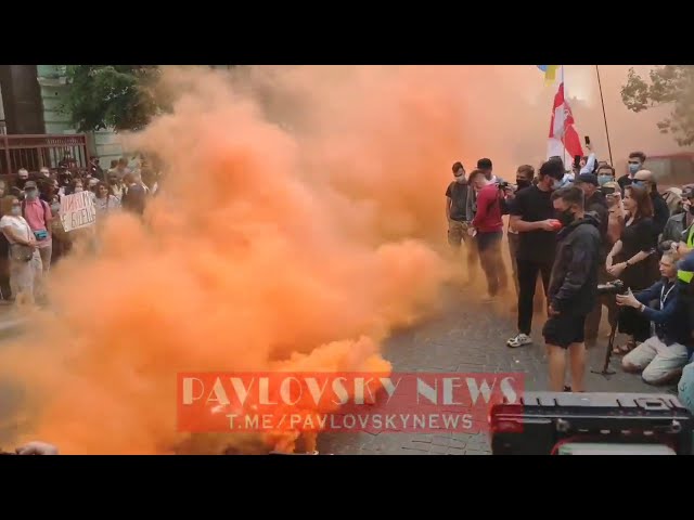 Участники протеста - их собралось около сотни - настаивают, что акция мирная. При этом митингующие перекрыли улицу Коцюбинского, вступают в словесные перепалки с полицией, жгут дымовые шашки, а один из протестующих, воспользовавшись тем, что пятачок перед забором заволокло оранжевым дымом, метнул в сторону посольства файер.