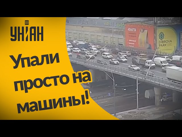 В результате падения трех опор освещения на Шулявском мосту в Киеве пострадали восемь автомобилей. Об этом столичная полиция.