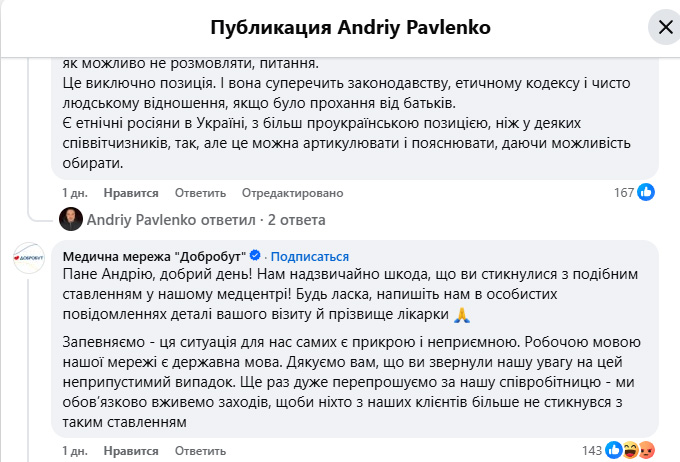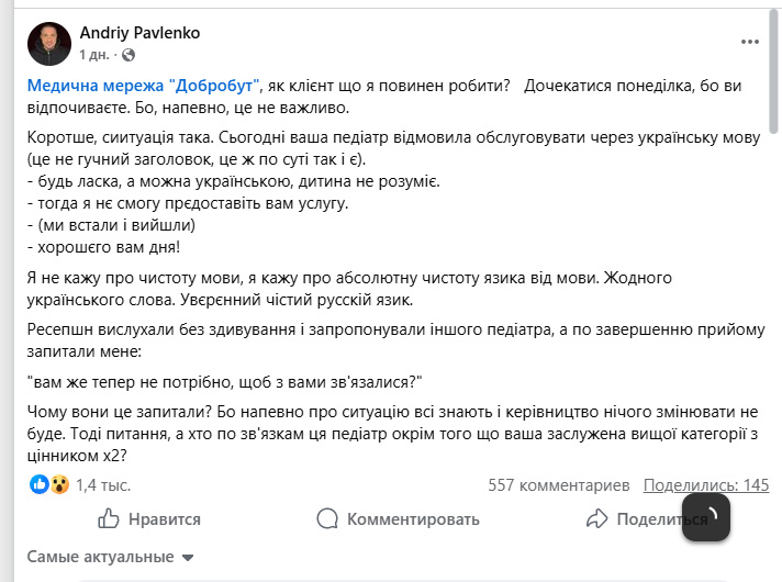 – Я не говорю о чистоте речи, я говорю об абсолютной чистоте языка от речи. Никакого украинского слова. Уверенный чистый русский язык. Ресепшн выслушали без удивления и предложили другому педиатру, а по завершении приема спросили меня: "вам же теперь не нужно, чтобы с вами связались?", – написал Павленко.