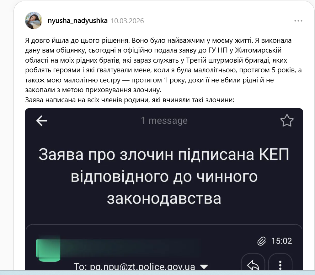 «Я долго шла к этому решению. Оно было самым трудным в моей жизни…» - этот пост Надежда Викарий изложила в социальной сети Threads этого марта. 31-летняя женщина рассказала, что наконец-то решилась написать в ГУ Нацполиции в Житомирской области заявление на двух родных братьев, которые насиловали ее, когда была малолетней, в течение 5 лет. И также якобы насиловали в течение года Дашу, «пока ее не убили родные и не зарыли с целью сокрытия преступления».