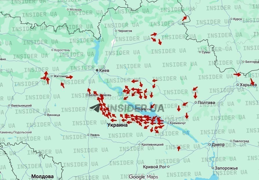 Киевщина. На подступах к столице продолжается интенсивная работа ПВО. Большая группа (около 90) дронов маневрирует вокруг города, их активно сбивают мобильные огневые группы. Один из дронов попал в многоэтажку в Обухове.