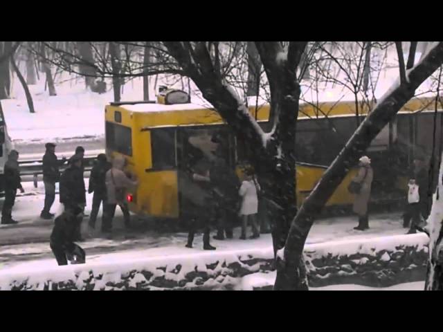 Из-за обильного снегопада 22 марта уже с 14 часов движение в Киеве было парализовано. На улице Олены Телиги пассажиры толкали застрявший автобус, который не мог тронуться с места на скользкой дороге.