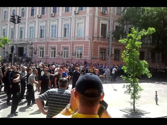"С обеих сторон летят бутылки с водой. Вмешалась милиции. Они разделили улицу на две части. Задержали около 10 человек", - отметил корреспондент.