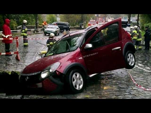 ЧП произошло на Подольском спуске. По предварительной информации на дороге во время обвала находился внедорожник. За рулем авто находилась девушка - журналист телеканала 1+1.