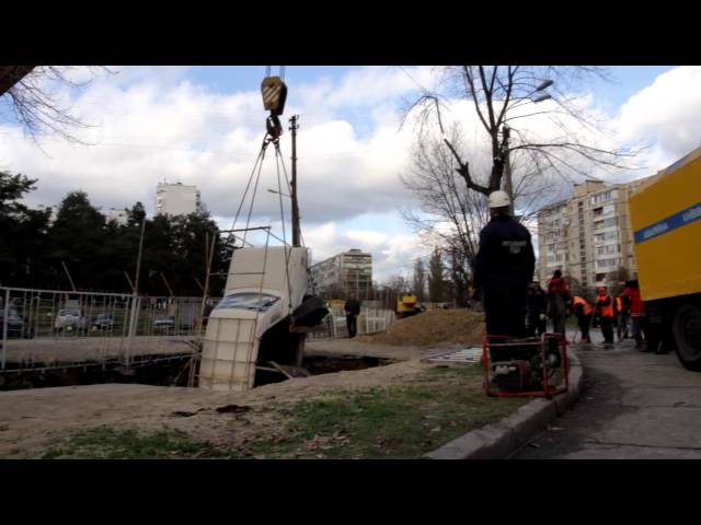 В дыру на обочине проезжей части угодила "Волга". Машина почти полностью загрузла в воде и песке. Сейчас коммунальщики пытаются извлечь автомобиль из ямы. Для этого нужно откачать воду.