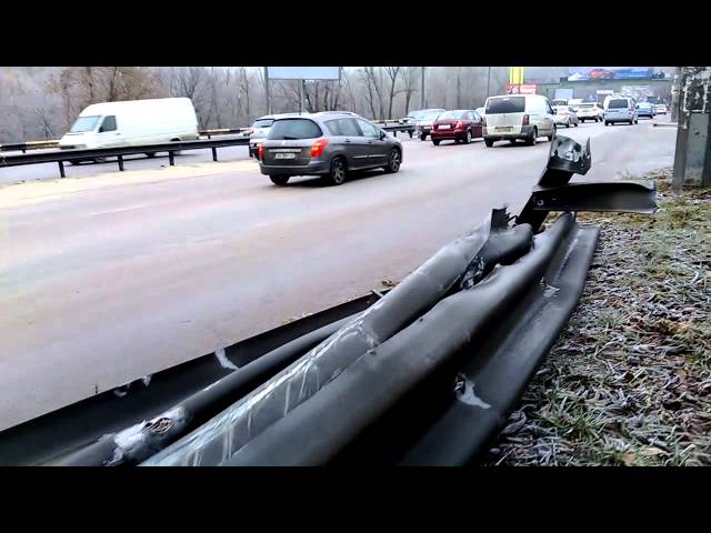 В районе Кирилловской церкви фура, пробив разделительное заграждение, въехала на встречную полосу и перевернулась.
