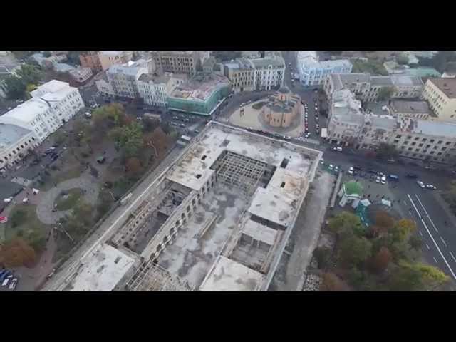 В итоге огромным склепом для погибших надежд стоит несчастное кирпичное здание посреди Контрактовой, отгороженное от любопытных глаз забором. Но если сбоку посмотреть на состояние Гостиного двора невозможно, то сверху – вполне. Бильд-редактор газеты "Комсомольская правда в Украине" Александр Гончаров с помощью дрона снял здание сверху. Выглядит оно, скажем прямо, удручающе. Старая кладка не выдерживает напора стихий, кирпичи обсыпаются, в крыше зияют дыры. Вокруг все поросло желтеющим бурьяном.