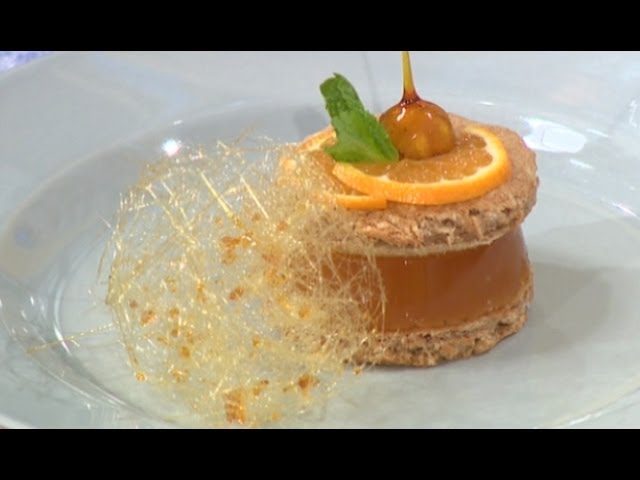 Из бисквита вырезаем фигурки, равные по размеру заготовкам из желе. Собираем пирожное: на бисквит выкладываем желе и накрываем еще одним кружком бисквита. Готовим карамель: сахар смешиваем с водой и нагреваем, пока он не станет золотисто-коричневого цвета. Украшаем фундуком с карамелью, ломтиком апельсина и мятой.
