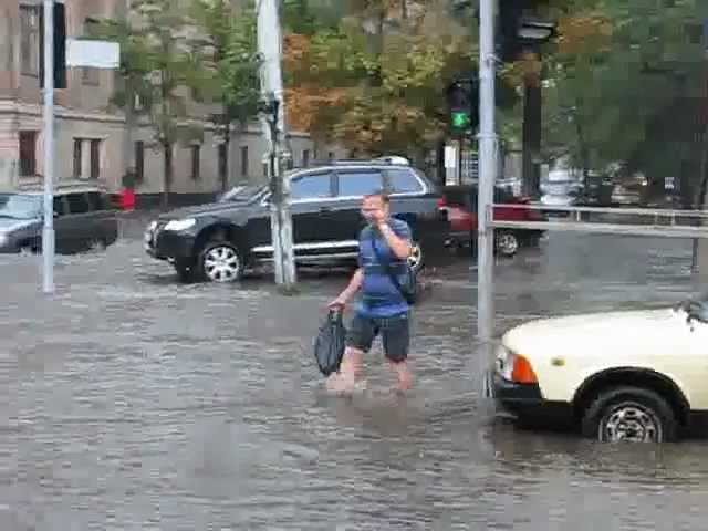 Сегодняшний ливень в Харькове некоторые улицы превратил в озера, а местами и моря. Вода разлилась настолько. что пешеходам приходилось переходить улицы по колено в воде, а водителям легковушек тихо красться по проезжей части, чтобы вода не попадала в двигатель, пишет 057.ua.