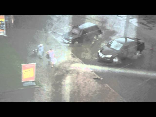 На этих улицах практически парализовано движение легкового транспорта, маршрутные такси стоят с обеих сторон дороги. На некоторых участках сорваны люки, вода фонтаном бьет на улицу. Дождь продолжается.