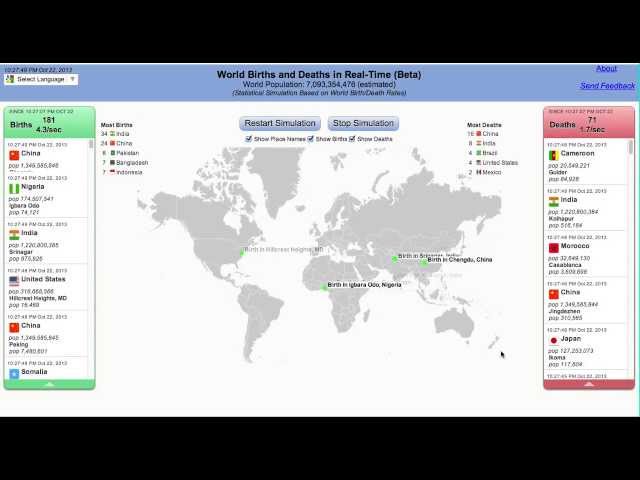Но впоследствии изыскания ученого переросли в работы по созданию глобальной карты, которая бы позволила отслеживать данные в режиме реального времени. Изменения на онлайн-карте появляются почти мгновенно - сервис извещает о каждых родах и смерти по всему миру. Кроме того, можно получить сведения об индексах рождаемости и смертности каждой стран. Так, в Украине эти коэффициенты, соответственно - 9,52 и 15,75.