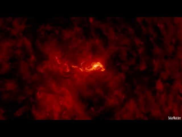 Американскому космическому агентству удалось сфотографировать это необычное явление в Солнечной обсерватории. По данным ученых, мощность этой вспышки можно сравнить с взрывов нескольких тысяч ядерных бомб, сообщает пресс-центр NASA.