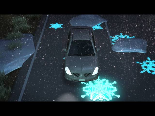 Кроме того, если температура падает ниже нуля и дорога становиться скользкой, разметка меняет цвет и на дороге появляются светящиеся синие снежинки, которые дают понять водителю ситуацию.