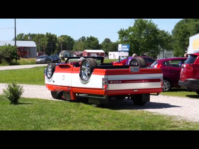 Верх автомобиля представляет собой половину "Форда", имеется все - фары, боковые зеркала и даже колеса. Есть даже особенный номерной знак, который читается как "FLIPOVR" (т.е. "flipover" - с англ. - "перевернутый").
