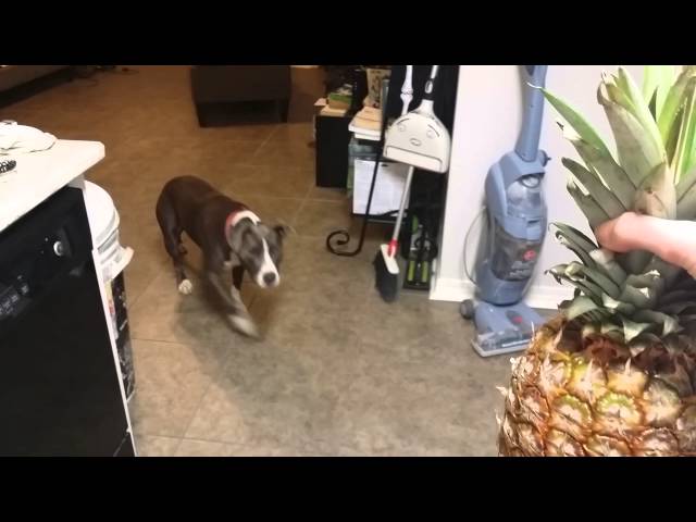 Когда на кухне появился тропический фрукт, Стелла принялась лаять на него. Хозяйка решила познакомить любимицу с ананасом и избавить питбуля от страха. Но вид перемещающегося плода заставил собаку отступить.